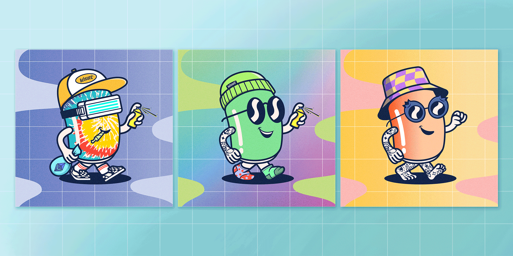 Leisure is a functional hydration drink mixed with a premium blend of natural electrolytes and essential vitamins. Poyant worked to create dynamic packaging illustrations and characters alongside brand designer Sean Morse. Additionally 1,000 unique NFTs were illustrated for a unique Web3 product launch creating a community of interested customers and resulting in a Third Place Dieline Award (2023 NFT Category).